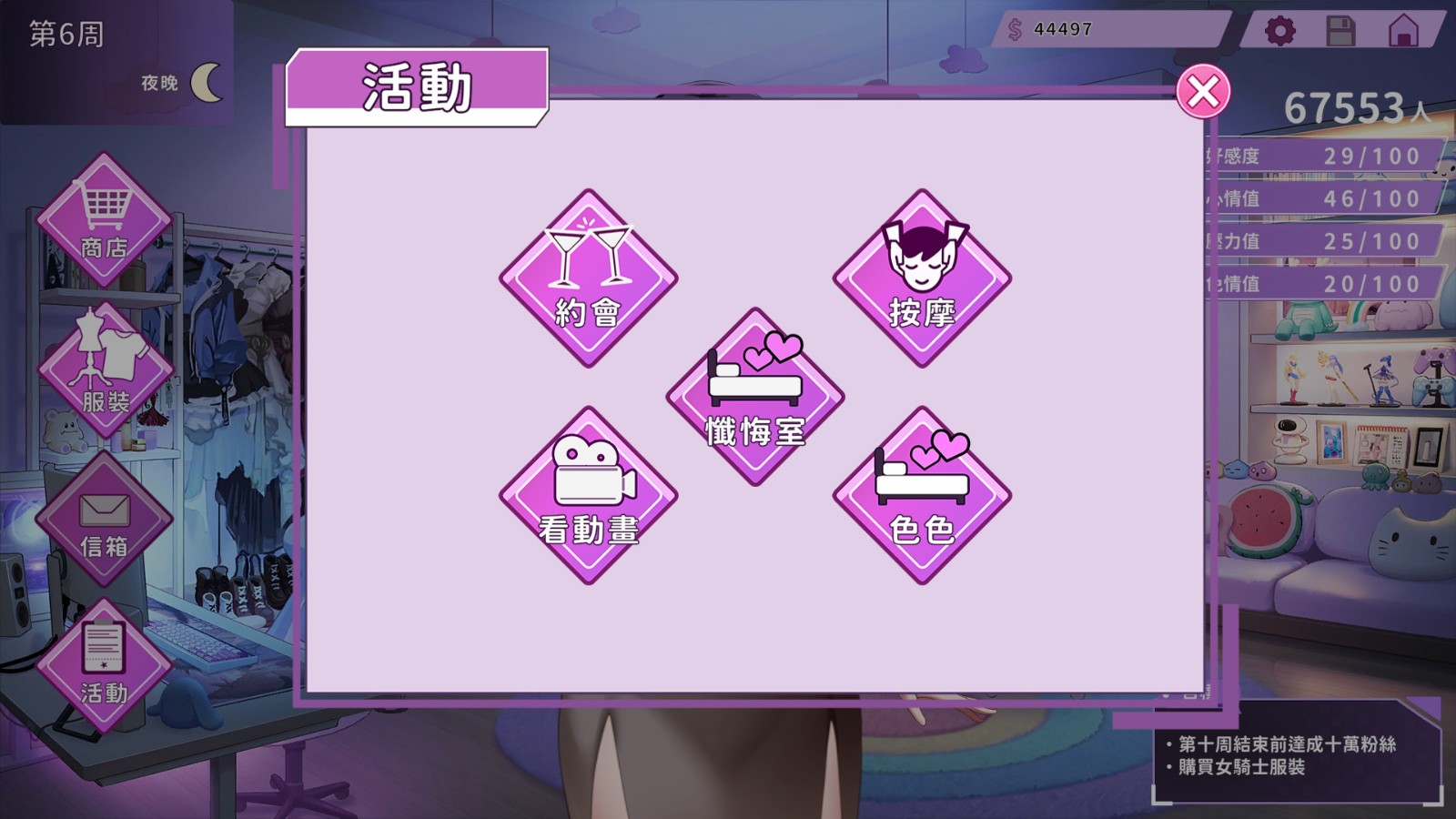 至于私下活动,则有约会、看动画、按摩、告解或色色等行为,色色不消说便是夫妻之间的鱼水之欢,而你还能在不同体位选择不同的衣装。